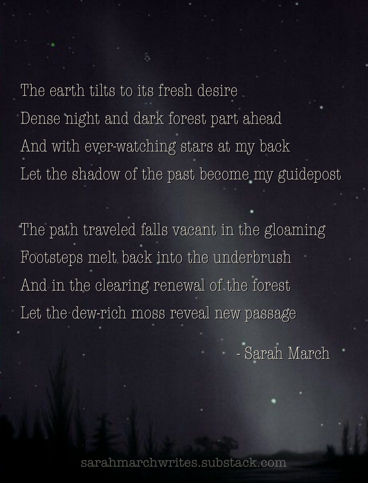 "the earth tilts to its fresh desire" and "footsteps melt back into the underbrush" are my two favourite lines, so good!!!!! tilt and melt are two excellent verbs and they have that nice sound similarity too (i forget the technical term, my brain is in hibernation, but you get me)