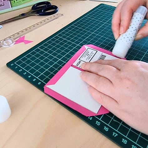 I’m using a piece of origami paper for this, but any lightweight paper would work. Thoroughly cover one side of each cover with glue and press firmly onto the inside of the cover paper. I eyeballed the placement, but I recommend leaving at least a half-inch allowance around the edges of the covers and about a half-centimeter in between the two covers for the spine. Trim off the excess paper (keeping the half inch allowance) and the corners of the edges, leaving just a tiny bit to ensure the paper covers the corners when it’s glued down. Now fold each side of the origami paper around the edges of the covers to create a nice crease. Cover the flaps with glue and fold them securely around the covers.