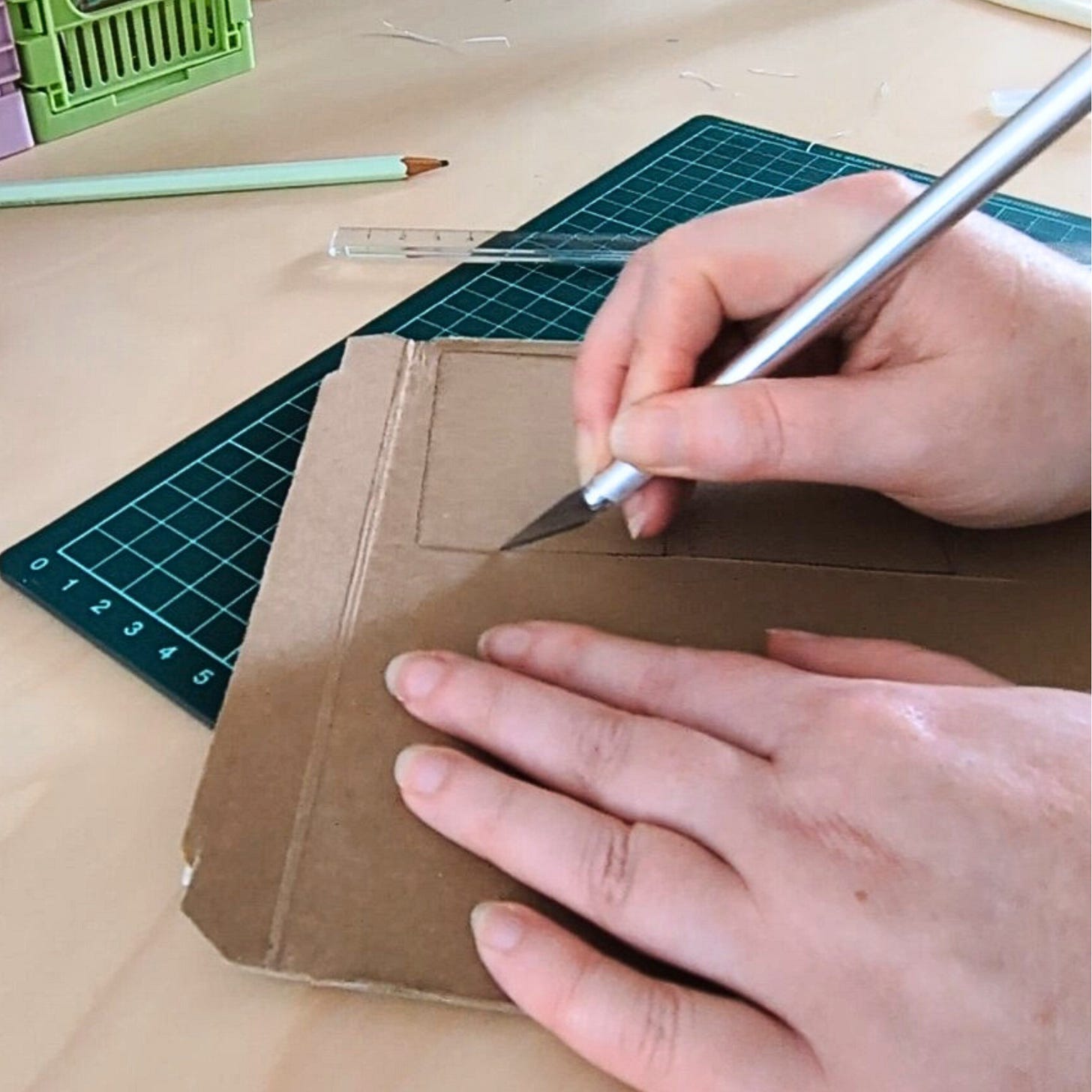 I up-cycled a flat mailer for the covers, but you could use a cardboard carton or heavy cardstock. Place the folded zine on the cardboard and trace around the edges. Do this twice, so you have a front and back cover. If you want your cover to be a bit larger than the pages, you could measure out an allowance around your tracing, but I’m all for not measuring stuff, so I kept them the same size. Once you’re happy with the size, cut out the covers.Connect the two covers.