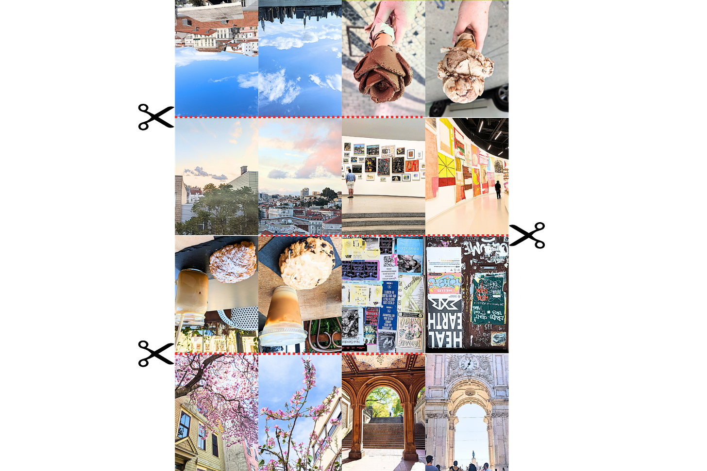 My zine, my two cities, shows side by side photos from my time in NYC and my current city, Lisbon. It’s a love letter to both cities, the person I was in New York, and the person I’m becoming in Lisbon. I’ve loved sharing this zine with everyone here on Substack, and I’ve been really touched by the kind words from so many of you. If you haven’t already read my original post about this zine and my struggle with a fear of failing, you can check that out here. What follows below is my attempt at a tutorial for this zine. Please keep in mind I’m new to zine creation and I tend to “wing it” when it comes to measuring things.